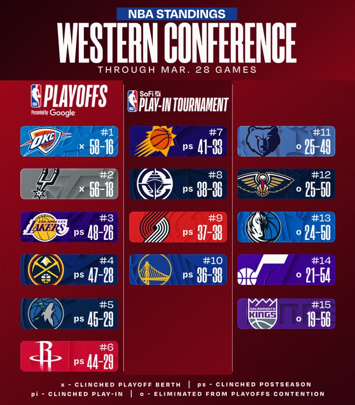 截至今日赛后的西部排名